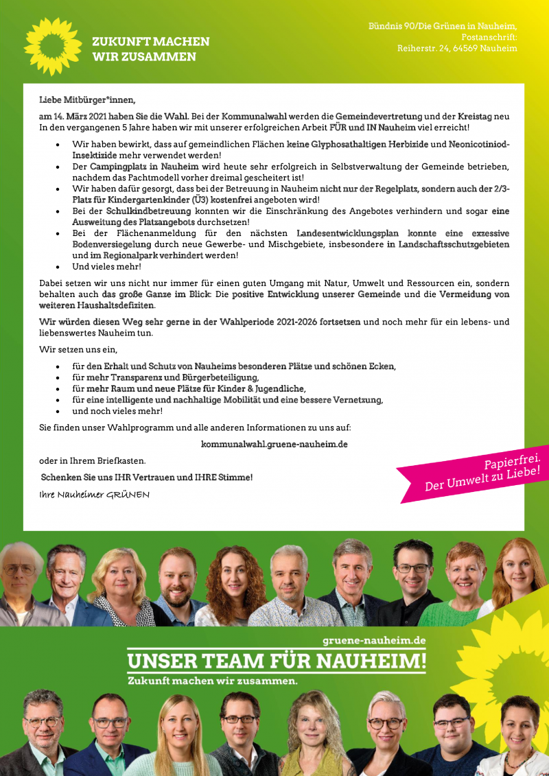 am 14. März 2021 haben Sie die Wahl. Bei der Kommunalwahl werden die Gemeindevertretung und der Kreistag neu gewählt. Auch wir GRÜNE in Nauheim treten wieder an und werben um Ihre Stimme.