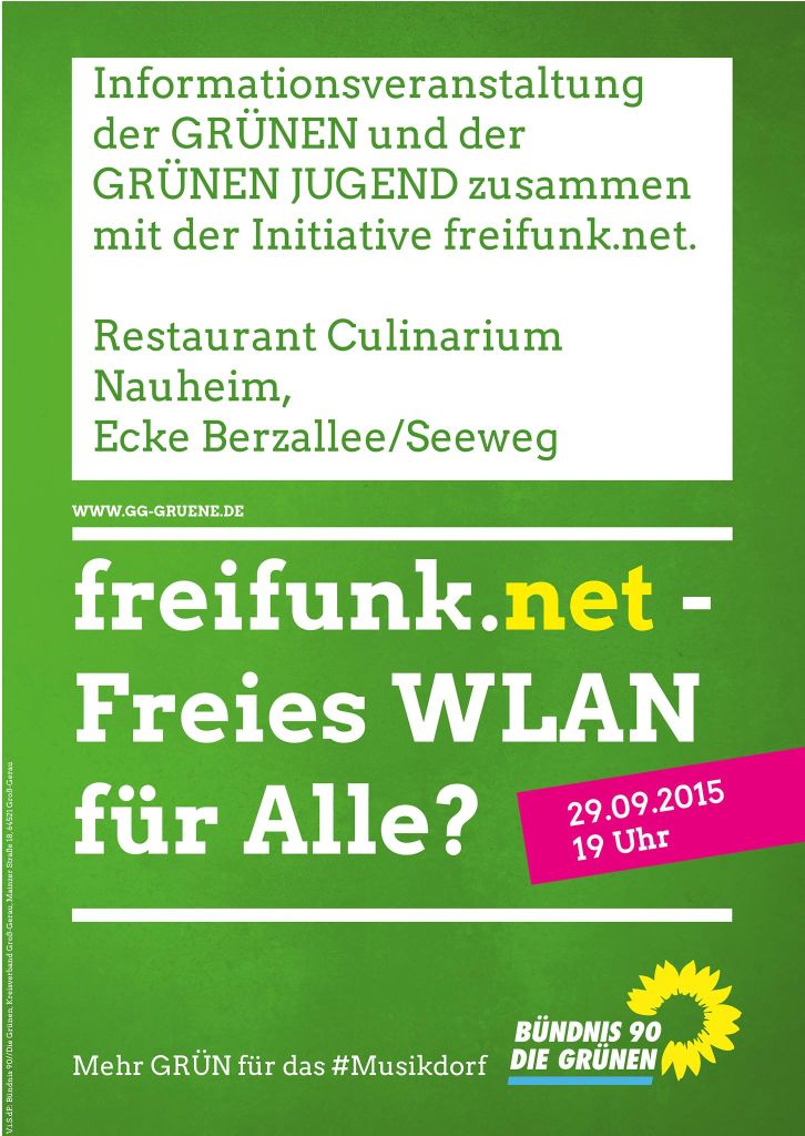plakatFreifunk ist ein Projekt, über das ein drahtloses Datennetz (WLAN) aufgebaut werden soll. Das Netz soll die freie Kommunikation innerhalb der ganzen Stadt und den Gemeinden und, mit Hilfe von Verbindungen zu anderen Gemeinden, auch überregional ermöglichen. Um dies zu erreichen betreiben Freiwillige an vielen Orten in der Stadt Freifunk-Knoten (Nodes). Ein Freifunk-Knoten ist ein speziell eingerichteter WLAN-Router, wie man ihn auch fürs Internet kennt. Jeder, der sich in der Nähe eines solchen Knotens aufhält, kann sich mit einem WLAN-fähigen Gerät (Handy, Notebook etc.) mit dem Netz verbinden und mit anderen Teilnehmern kommunizieren. Auch ein Zugang ins Internet steht zur Verfügung.