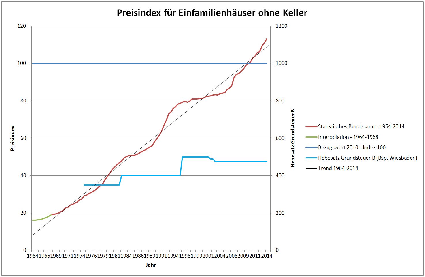 Schauen wir uns doch an, was bei der Grundsteuer B passiert. Die Einheitswerte zur Ermittlung der Grundsteuern stammen aus dem Jahr 1964. Seit diesem Zeitpunkt wurden keine neuen Bewertungsmaßstäbe ermittelt. Jedes im Jahr 2014 gebaute Haus wird bewertet, auf Maßstäben die schon 1964 galten. Verfolgt man die Daten des Statistischen Bundesamtes (leider erst ab 1968) liegt der Preisindex für ein Einfamilienhaus ohne Keller 1975 bei 29,1 Index-Punkten. Im Jahr 2014 jedoch bereits bei 113,2. Eine Steigerung um 289 % – während der Einheitswert unverändert blieb.