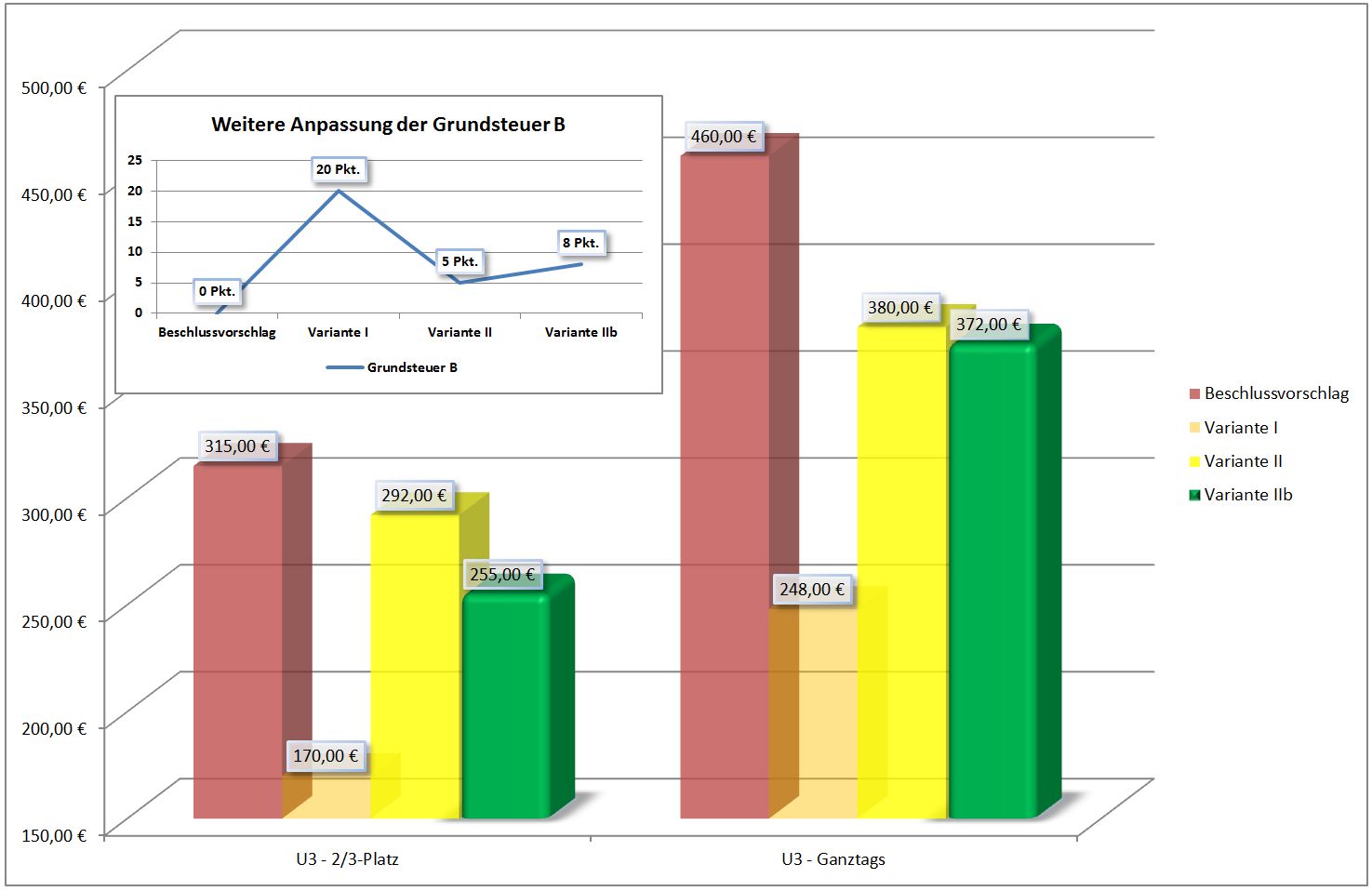 Variante IIb: Anhebung der U3-Gebühren auf Niveau 1-2-3 Käsehoch, Kompensation der damit verbundenen Mindereinnahmen über die Grundsteuer B um weitere 8 Punkte.