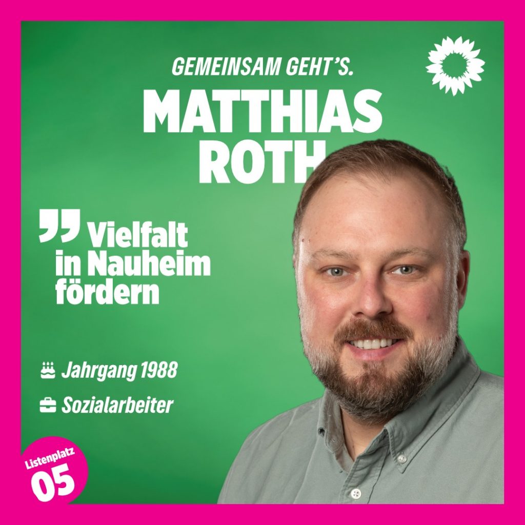Listenplatz 5: Matthias Roth Auf Listenplatz 5 kandidiert Matthias Roth. Mitglied des Kreistags und Geschäftsführer bei Pro Familia. Unsere Kandidat*innen