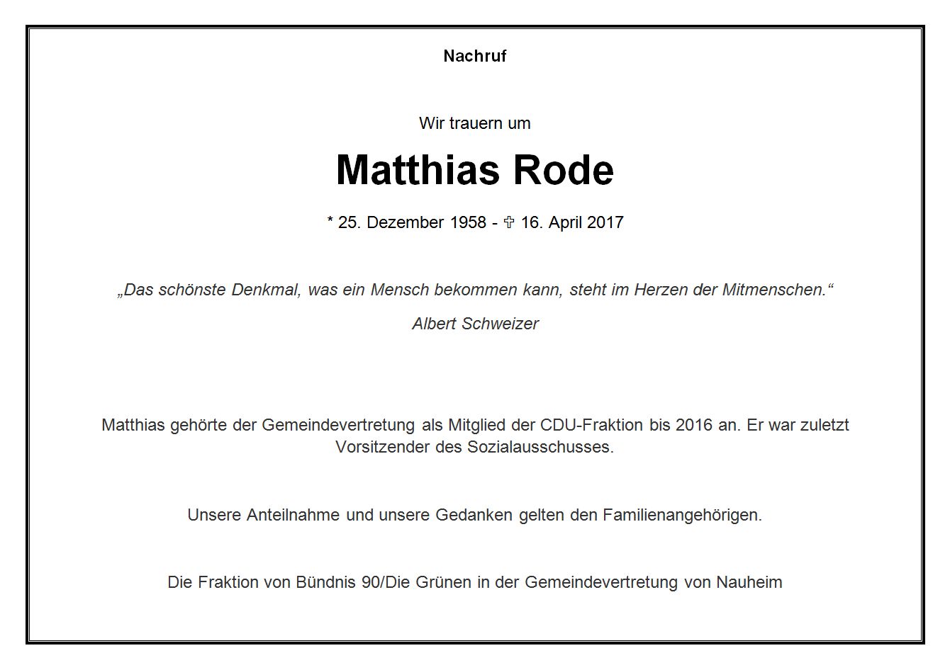 Matthias gehörte der Gemeindevertretung als Mitglied der CDU-Fraktion bis 2016 an. Er war zuletzt Vorsitzender des Sozialausschusses.