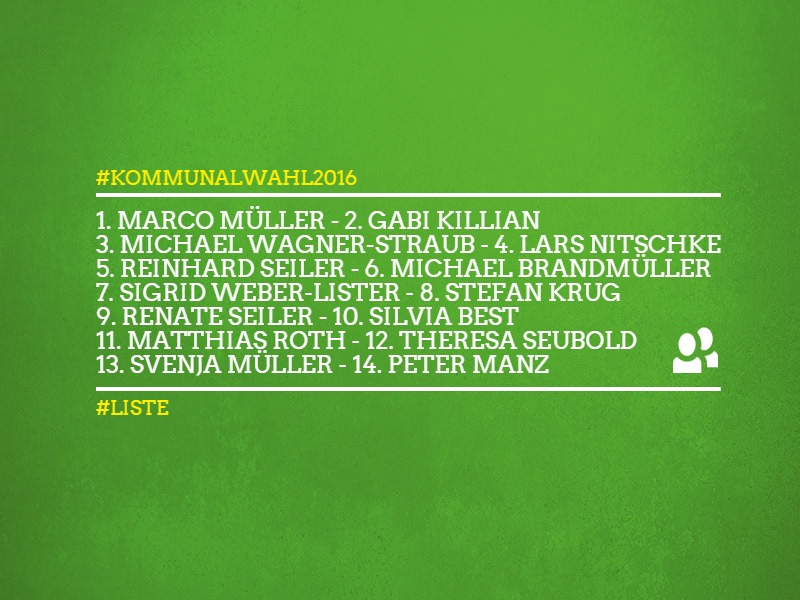 Die Listenaufstellung für die Kommunalwahl fand am 13. November 2015 im Nebenraum der Gaststätte „Zum Sporthaus“ statt. In Anwesenheit von 12 Gästen, davon 9 Wahlberechtigten, und der Presse wurde die Liste für die Kommunalwahl aufgestellt. Die Kistenaufstellung wurde von Doro Hofmann, die Vorstandssprecherin des Kreisverbandes von Bündnis 90/Die Grünen in Groß-Gerau ist, geleitet.