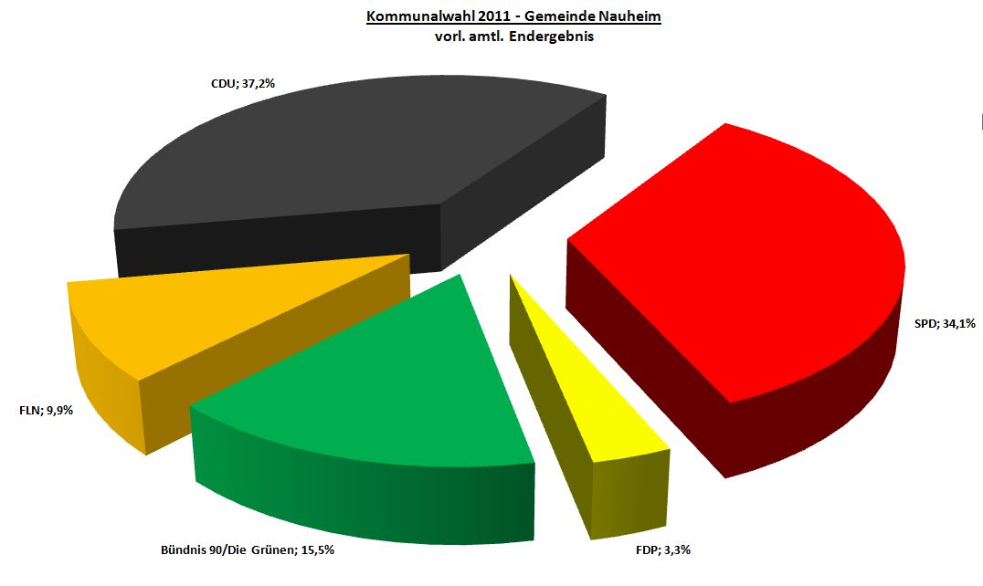 So, nach dem wir heute morgen noch das Trendergebnis aufgezeigt haben, hat die Gemeinde inzwischen das vorl. amtl. Endergebnis veröffentlicht. Leider konnten wir nach dem kummulieren und panaschieren nicht mehr ganz den Trend bestätigen. Trotzdem erreichen wir (für Nauheim) immer noch überragende 15,5% im Endergebnis. Stärkste Partei nach dem Endergebnis ist die CDU mit 37,2% vor der SPD mit 34,1%. Die Grünen sind somit weiterhin drittstärkste Partei vor der FLN (9,9%) und der FDP (3,3%). Die Sitzverteilung ist noch nicht offiziell bestätigt. Nach dem Verfahren Hare-Niemeyer ergibt sich allerdings folgende Verteilung:
