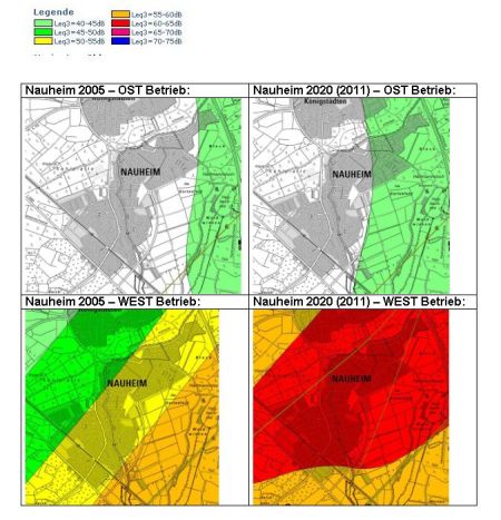 Durch die Inbetriebnahme der Nordwest-Bahn im Winterflugplan 2011 wird eine Neuaufteilung der Flugrouten notwendig, da ein Abflug über den Taunus dann nicht mehr möglich ist. Durch diese Aufteilung wird die Lärmbelastung Raunheims bei allen Wetterlagen sinken – was wir ausdrücklich begrüßen. Nauheim wird durch diese Aufteilung jedoch zusätzlich belastet. Die Betriebsrichtung OST ist weitestgehend zu vernachlässigen, da hier die Zunahme nur marginal ist.