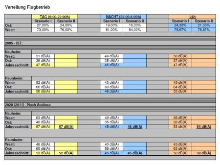 Um diesen Effekt richtig darzustellen haben wir die Werte von Nauheim und Raunheim erfasst und in eine Übersichtstabelle gepackt. In dieser Tabelle haben wir einerseits Tag- und Nacht-Betrieb unterschieden, als auch zwei unterschiedliche Szenarien hinterlegt. Szenario I stellt dabei die Verteilung der Betriebsrichtungen im langjährigen Mittel dar (s.oben). Szenario II verweist auf das Anti-Lärm-Paket im Punkt „Rückenwindkomponente“ (Quelle: Hintergrundinformation) und der Annahme, dass die Betriebsrichtung WEST an zusätzlichen 12 Tagen im Jahr beflogen wird. Die Betriebsrichtung OST reduziert sich entsprechend: